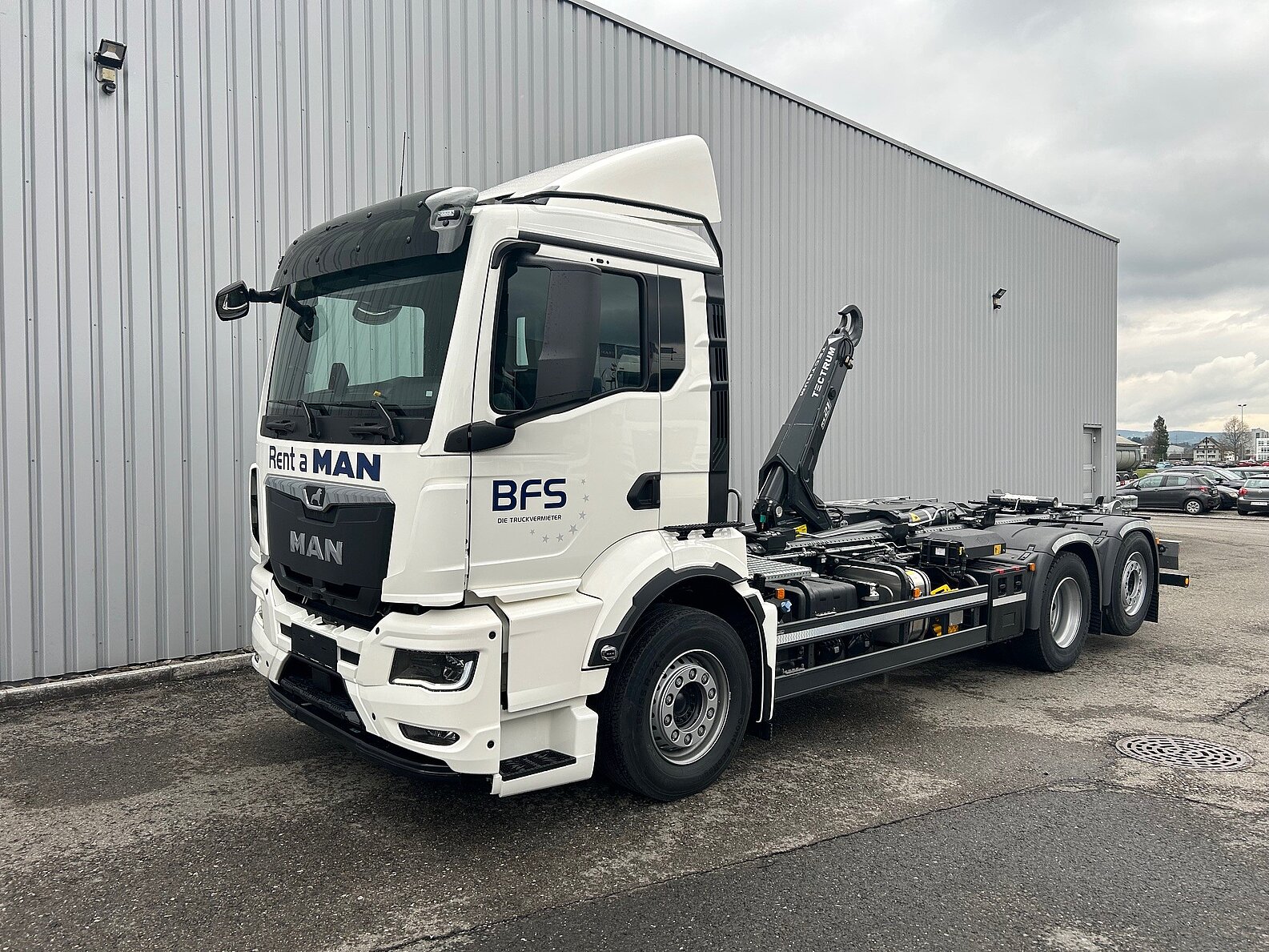 Abrollkipper mit Funkbedienung, Hydraulischer Unterfahrschutz, Muldenlänge bis 7.5m, Rockinger, Luftanschlüsse gelb/rot und Duomatic.
